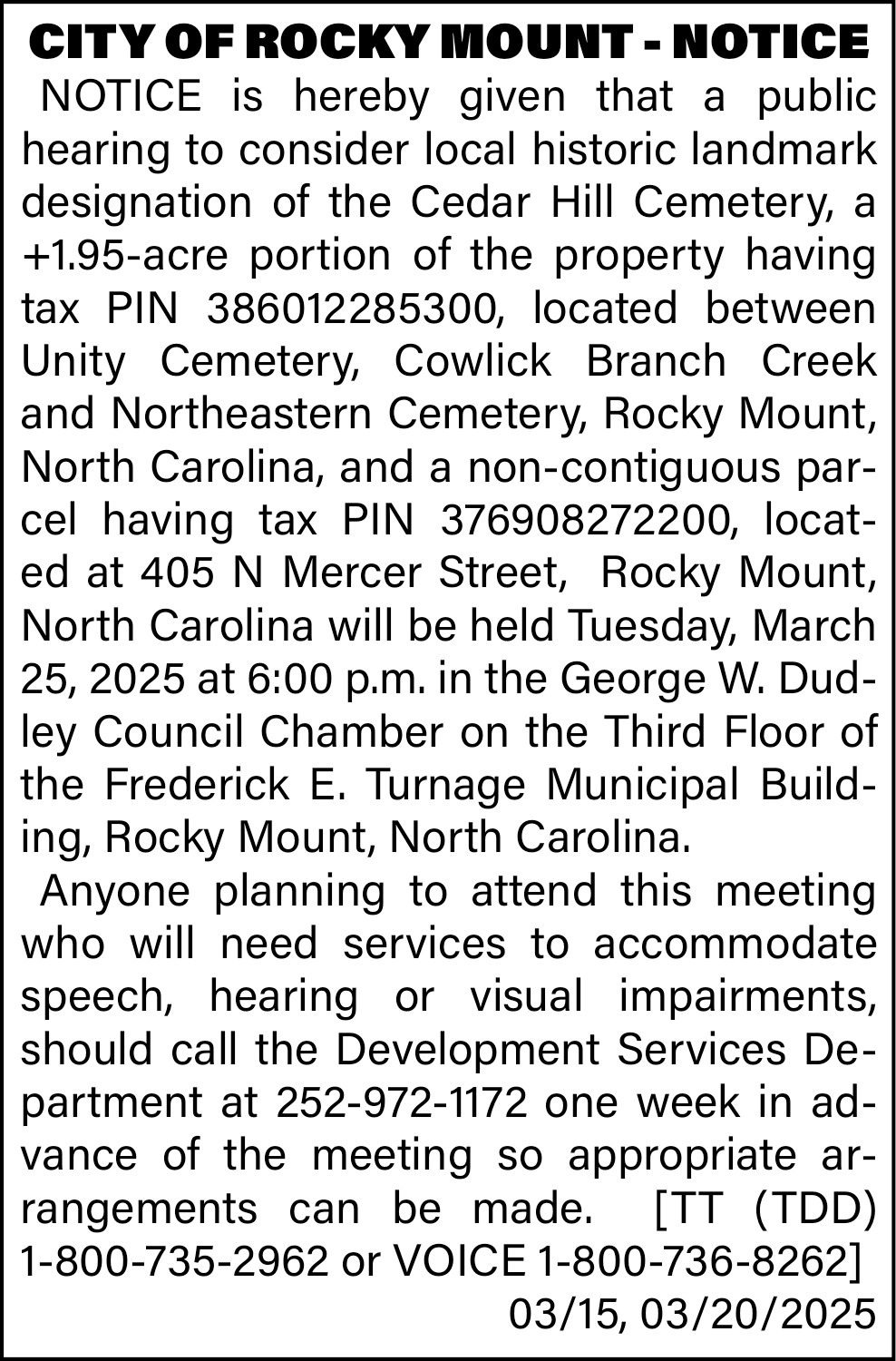 Mar 14, 2025. City of Rocky Mount Public Notice Ads from Rocky Mount Telegram