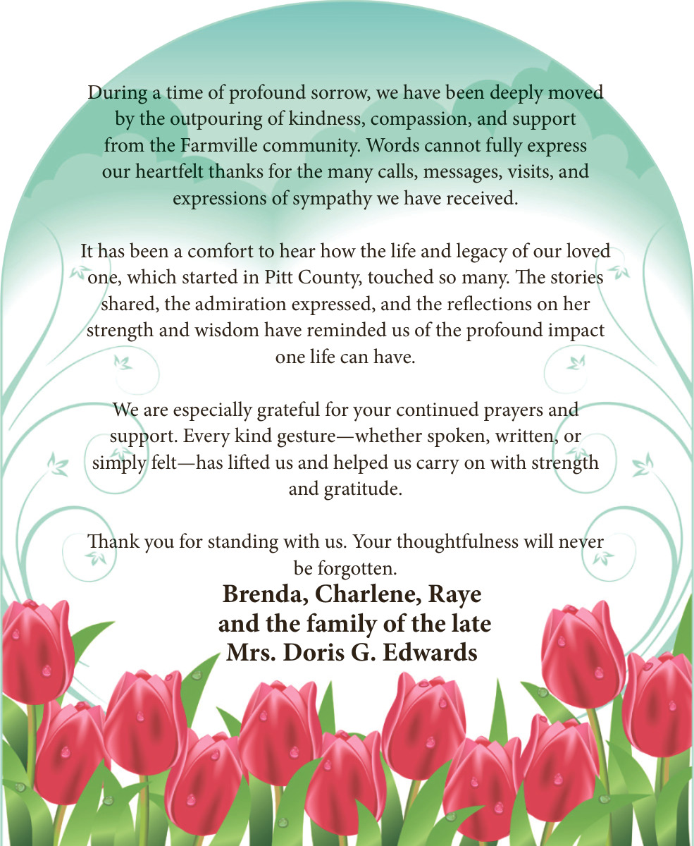 Jun 20, 2025. Brenda, Charlene, Raye and the Family of the Late Mrs. Doris G. Edwards Misc Ads from The Daily Reflector