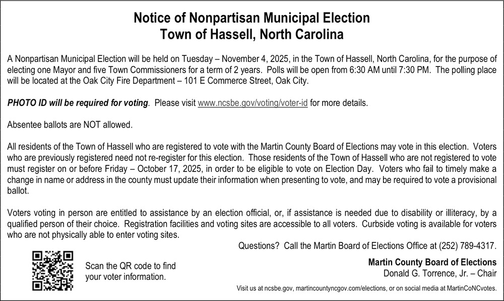 Notice of Nonpartisan Municipal Election Town of Hassell, North Carolina