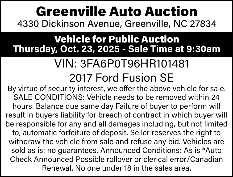 Oct 15, 2025. Greenville Auto Auction Auctions Ads from The Daily Reflector