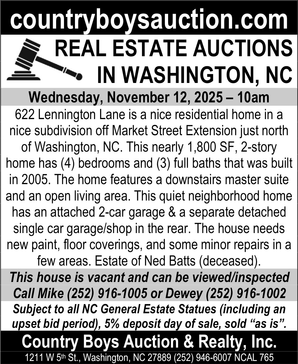 Oct 18, 2025. Country Boys Auction & Realty, Inc Auction Ads from The Daily Reflector