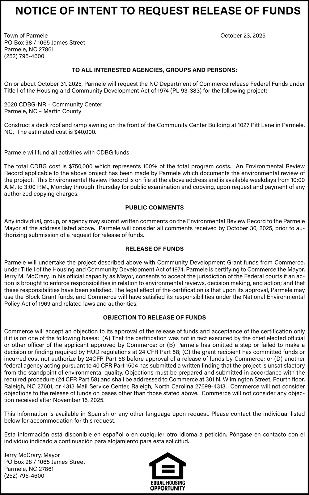 Oct 23, 2025. Jerry McCrary Public Notice Ads from The Daily Reflector