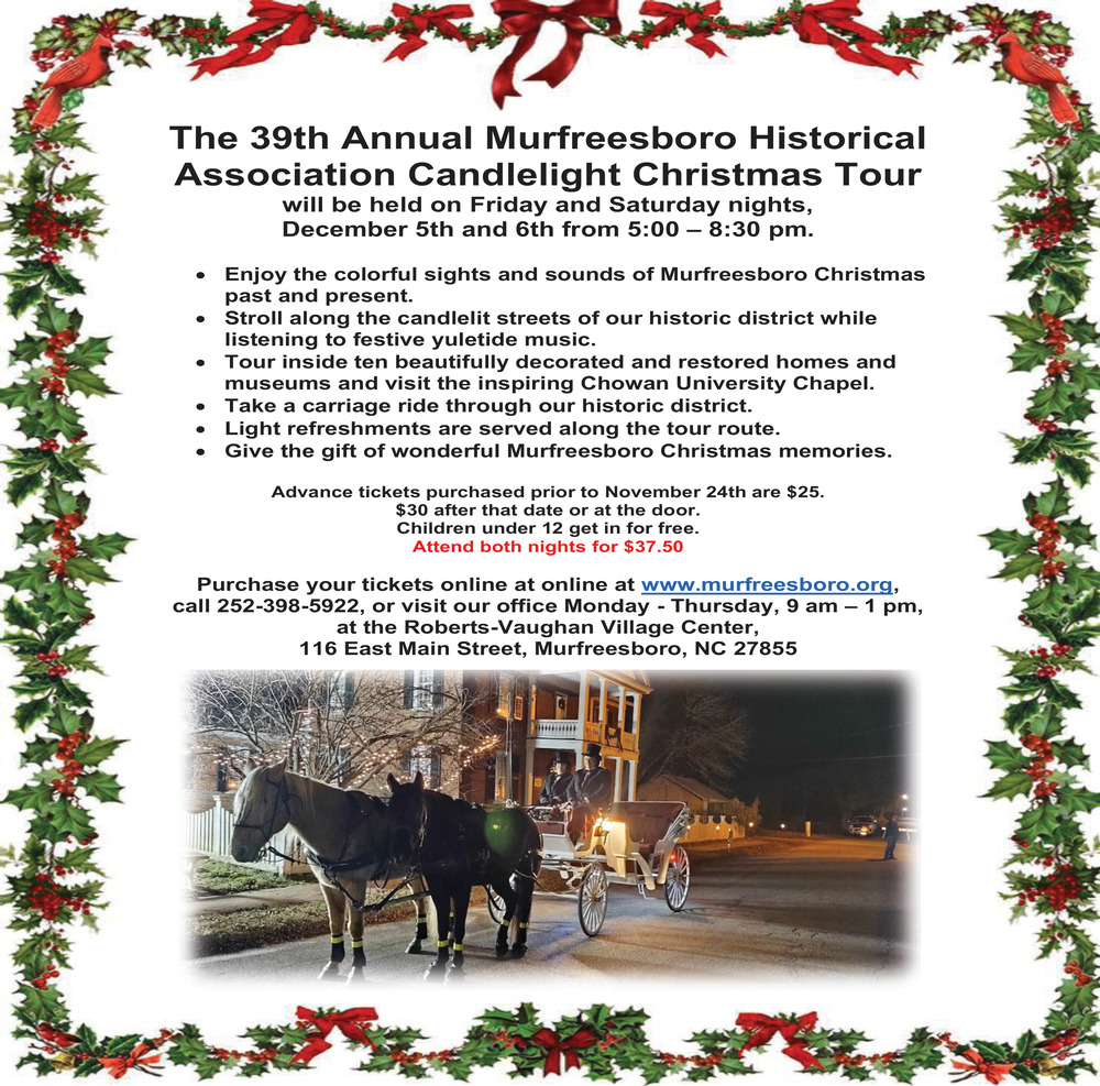 Nov 22, 2025. The 39th Annual Murfreesboro Historical Association Candlelight Christmas Tour Events Ads from Chowan Herald