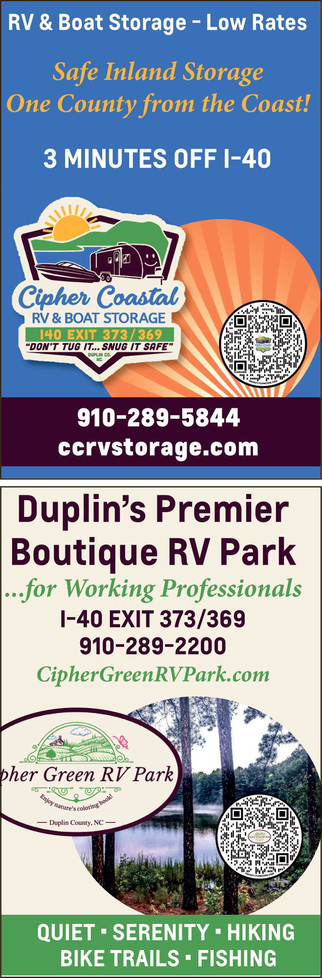 Ads for Cipher Coastal RV & Boat Storage - Cipher Green RV Park in Warsaw, NC