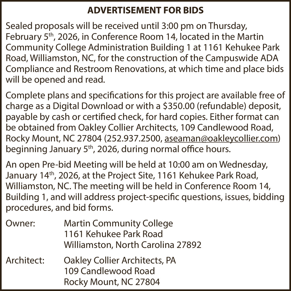 Jan 01, 2026. Martin Community College Public Notice Ads from Bertie Ledger-Advance