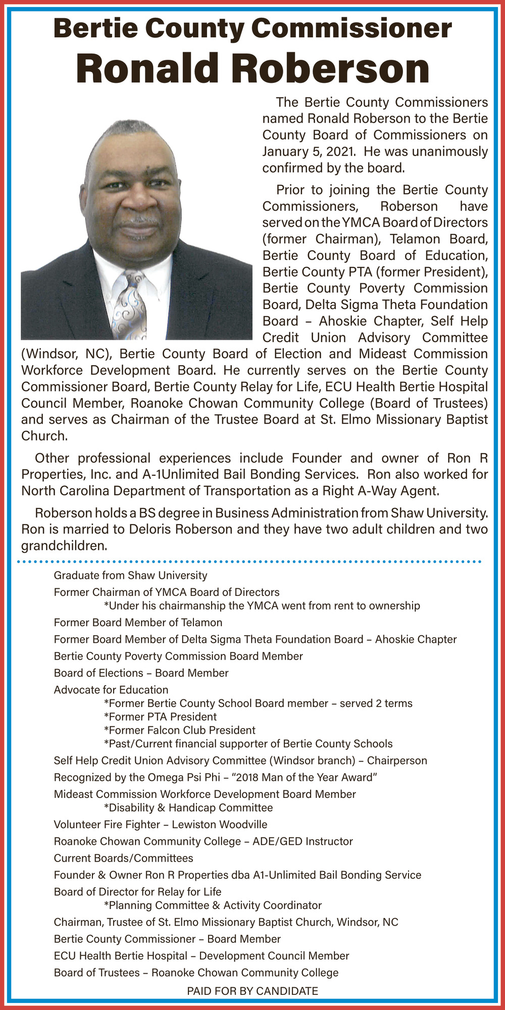 Feb 14, 2026. Bertie County Comissioner Ronald Roberson Government Ads from Bertie Ledger-Advance