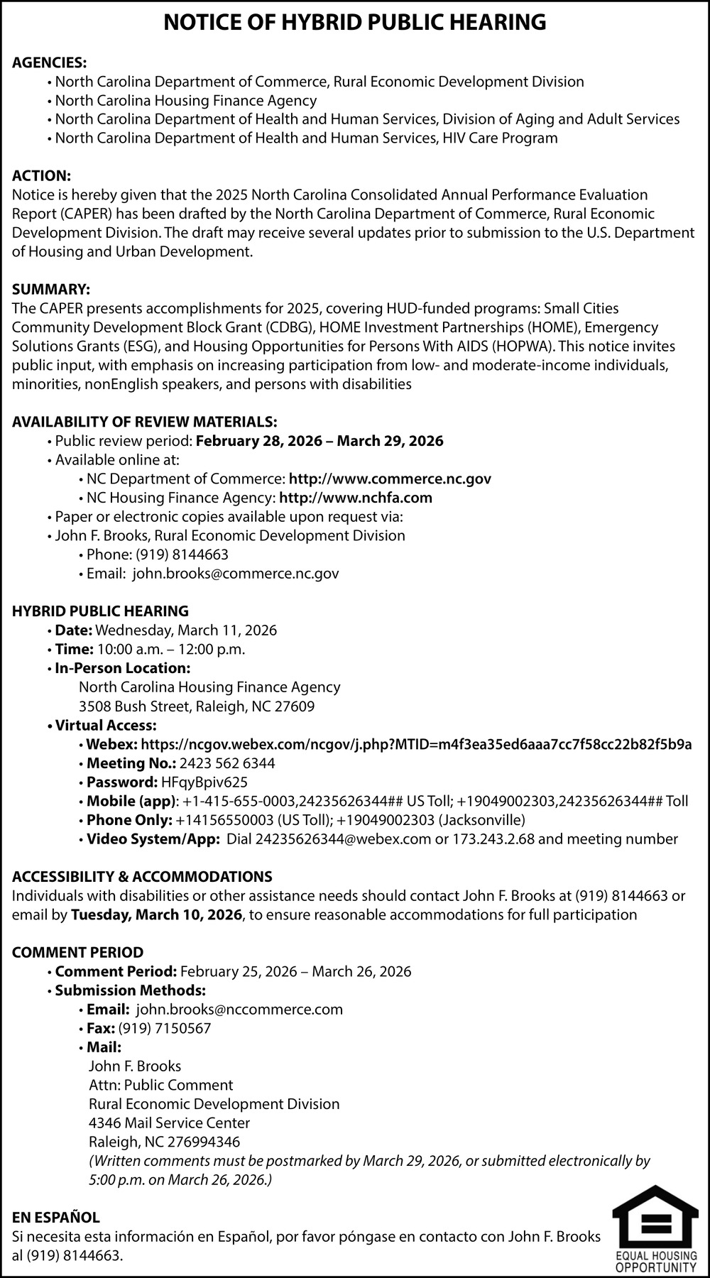 Feb 21, 2026. State of North Carolina Government Ads from The Daily Reflector