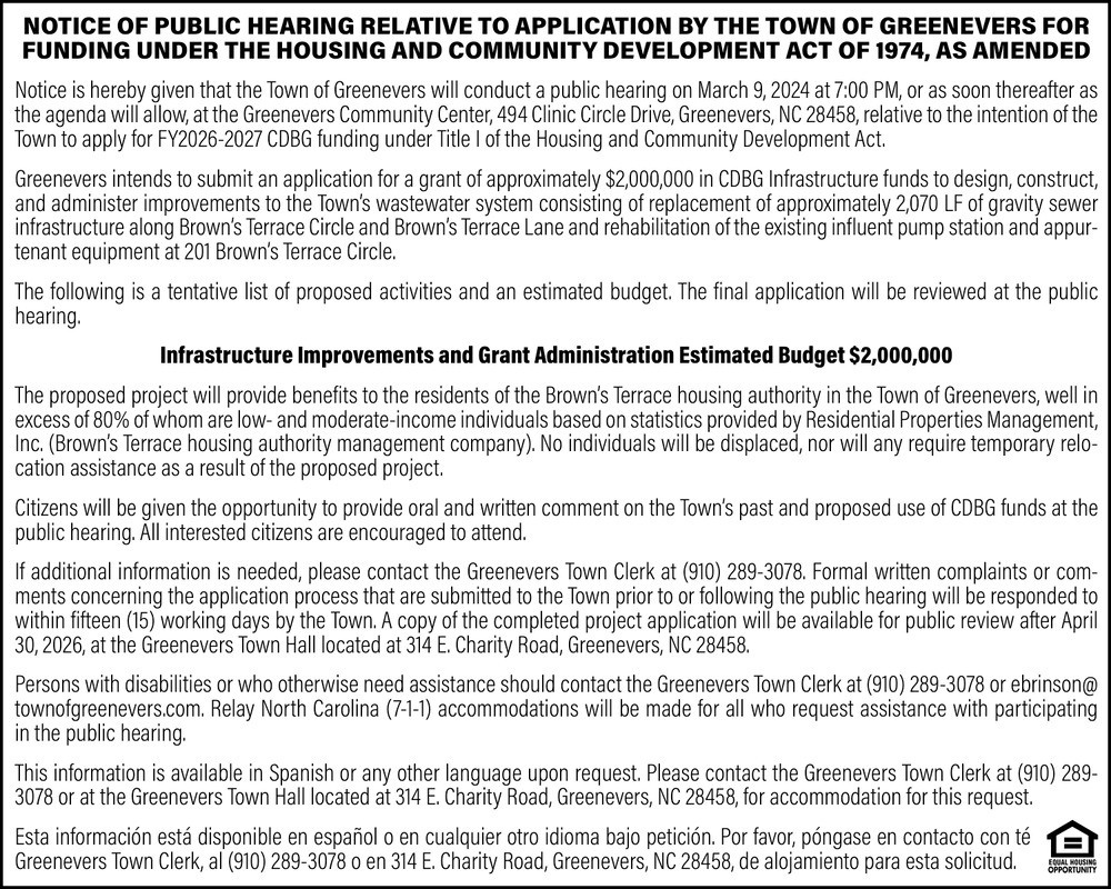 Feb 26, 2026. Town of Greenevers Government Ads from Duplin Times
