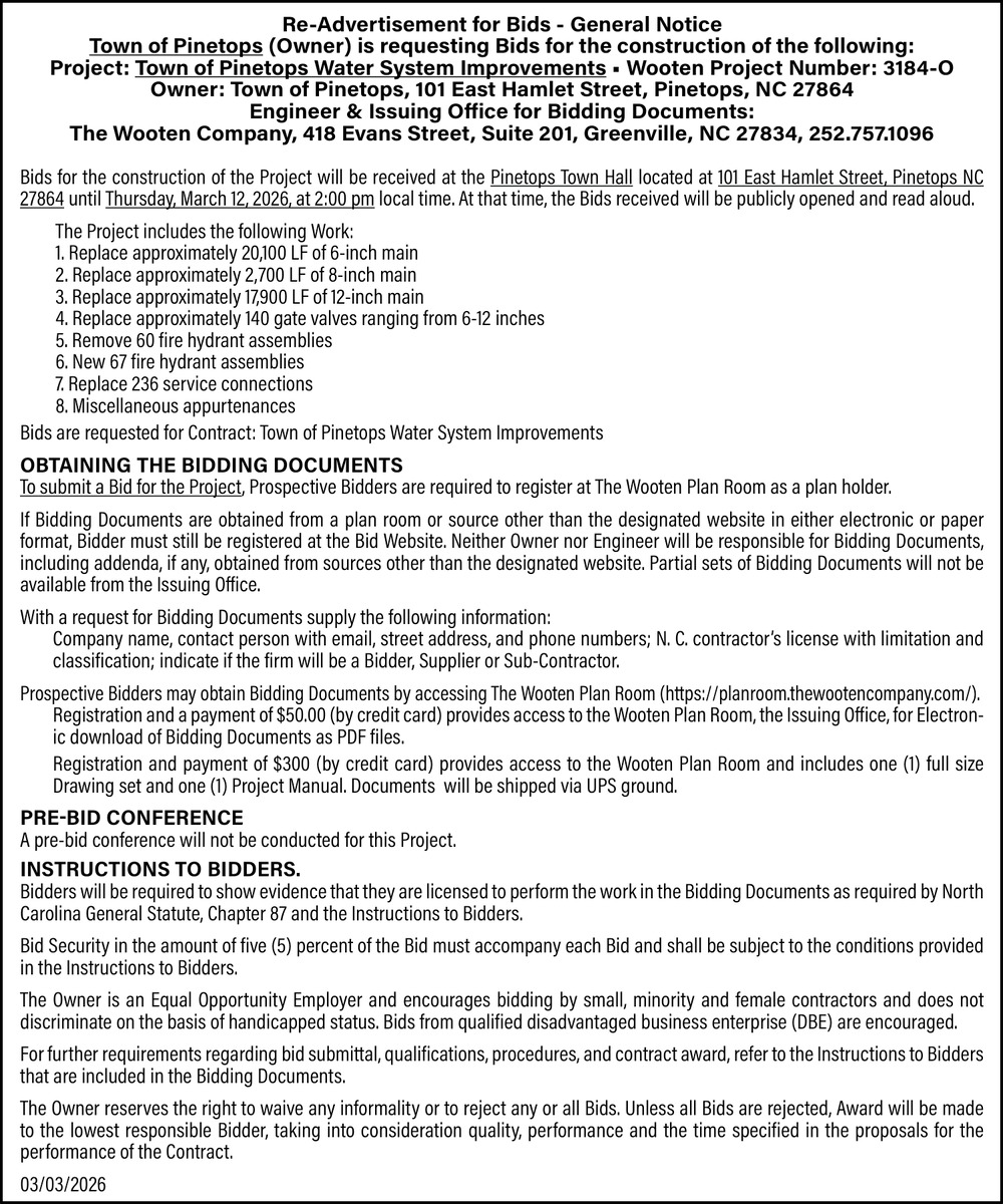 Mar 03, 2026. Town of Pinetops Government Ads from The Daily Reflector
