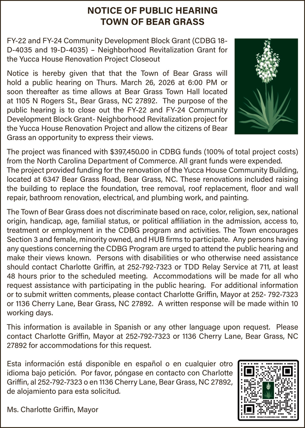 Mar 12, 2026. Town of Bear Grass Government Ads from The Enterprise