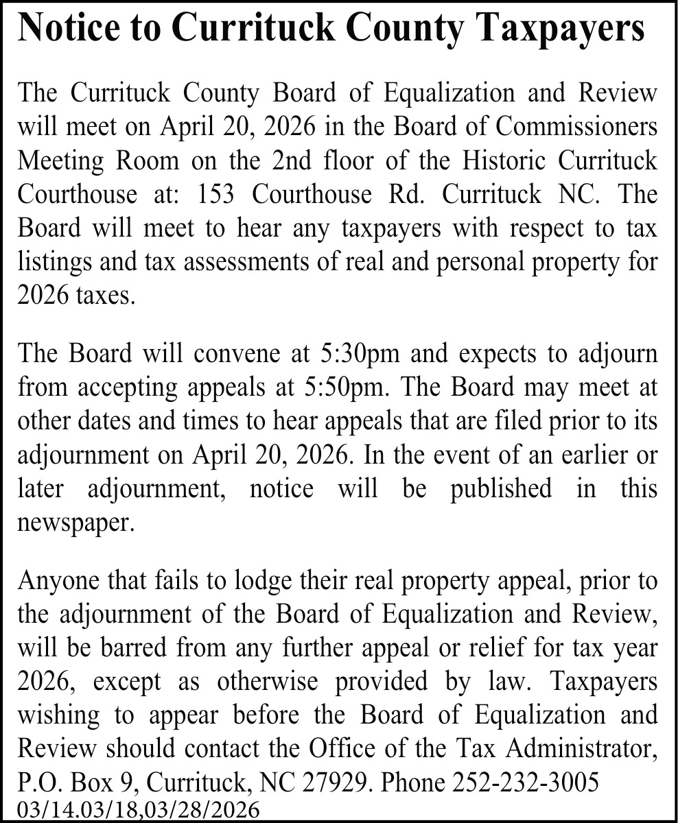 Mar 14, 2026. Currituck County Board of Equalization and Review Government Ads from The Daily Advance