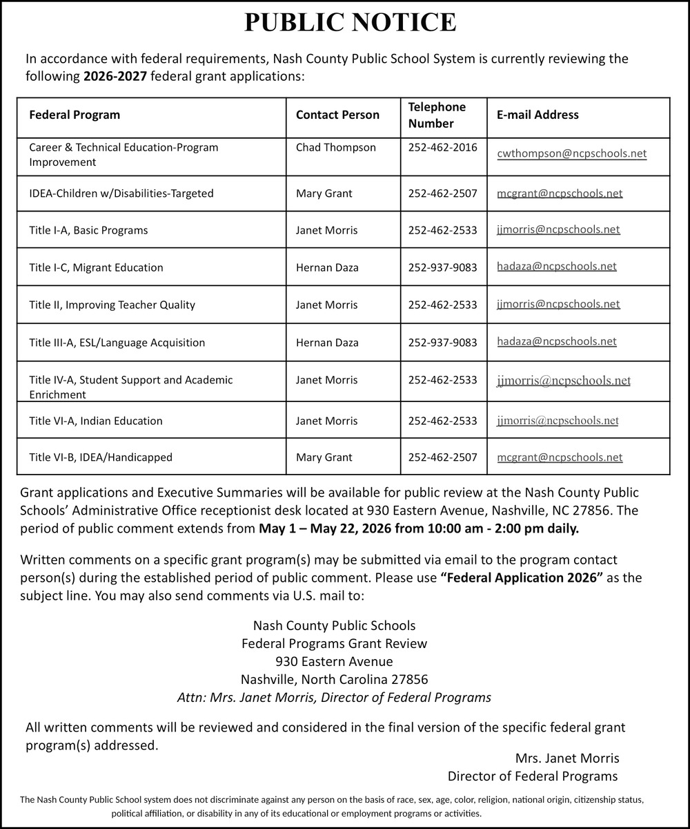 Apr 01, 2026. Nash County Public Schools Education Ads from Rocky Mount Telegram