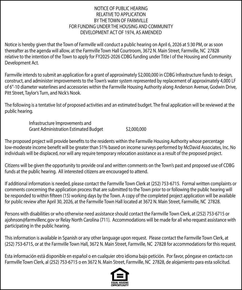 Apr 01, 2026. Town of Farmville Public Notice Ads from The Daily Reflector