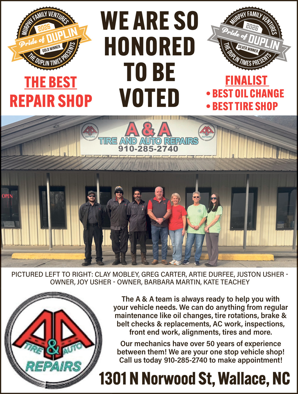 Apr 09, 2026. A & A Tire and Auto Repairs Auto Services Ads from Duplin Times