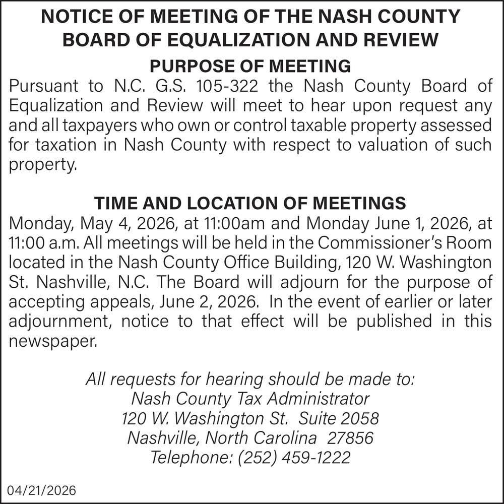 Apr 21, 2026. Nash County Board of Equalization and Review Public Notice Ads from Rocky Mount Telegram