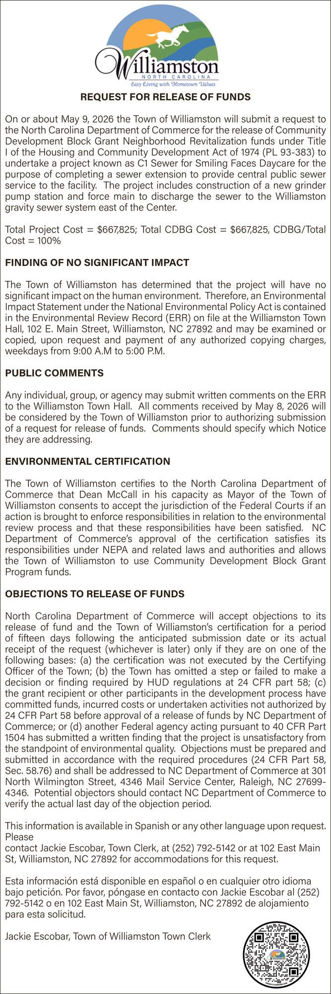 Apr 23, 2026. Town of Williamston Public Notice Ads from The Enterprise