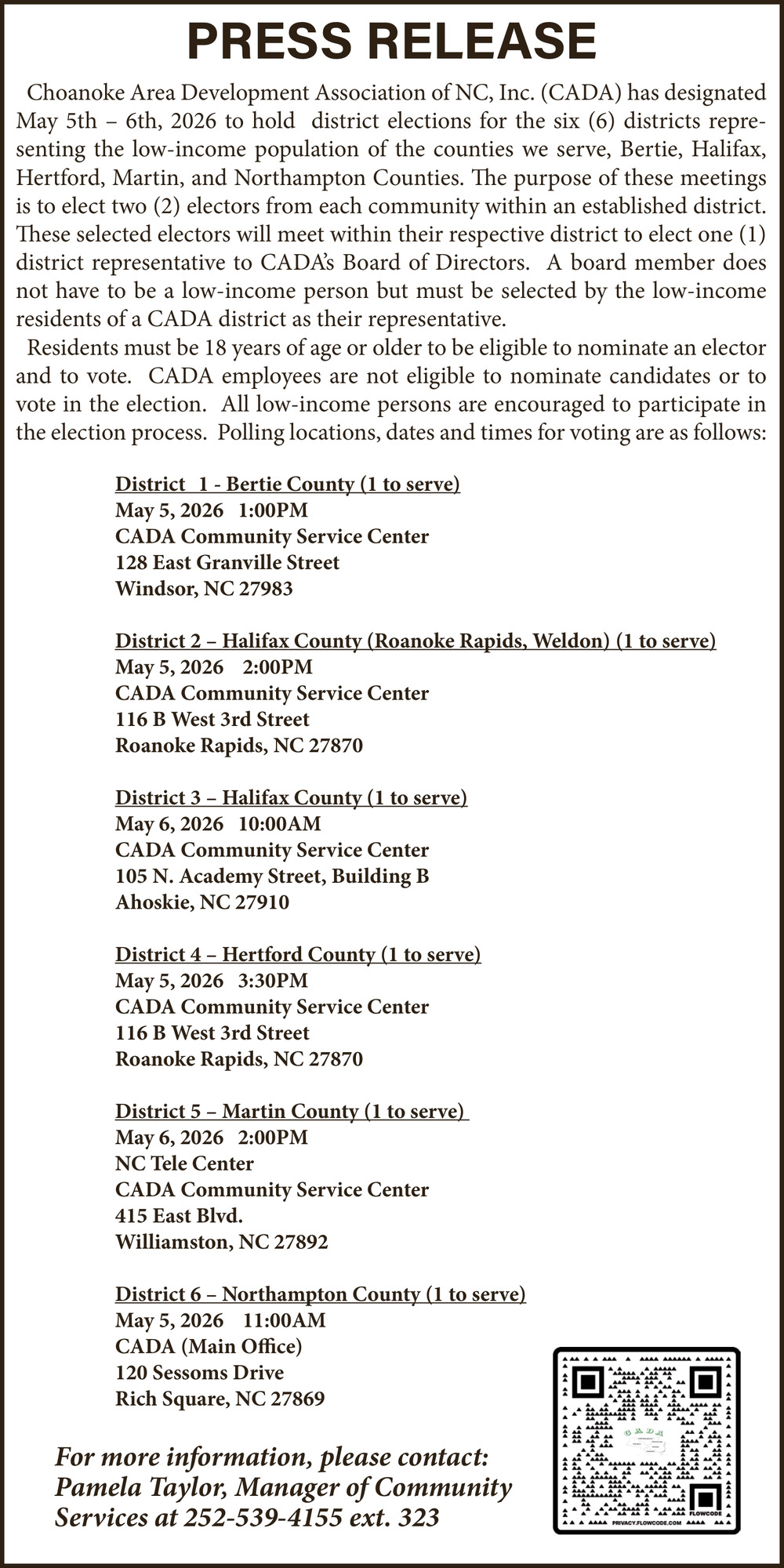 Apr 30, 2026. CADA - Choanoke Area Development Association of NC, Inc Government Ads from Bertie Ledger-Advance