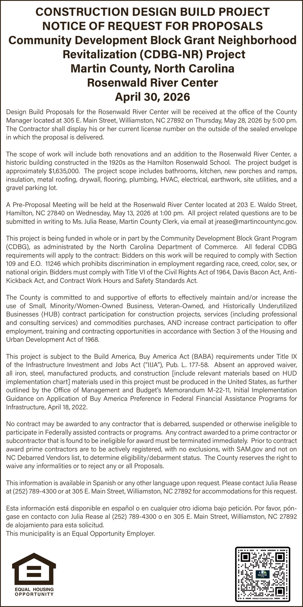 Construction Bid in Williamston, NC